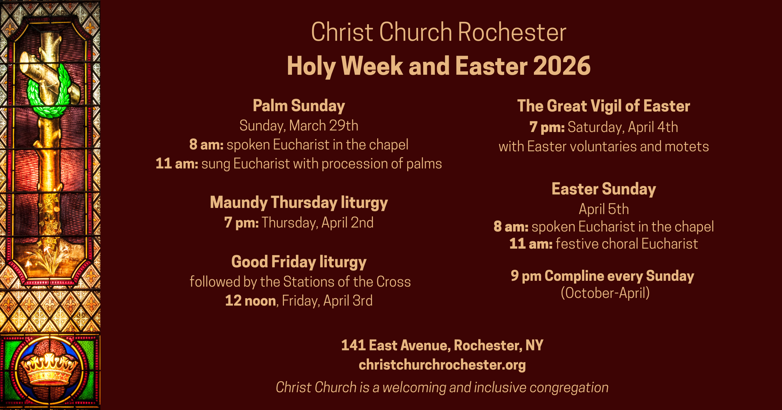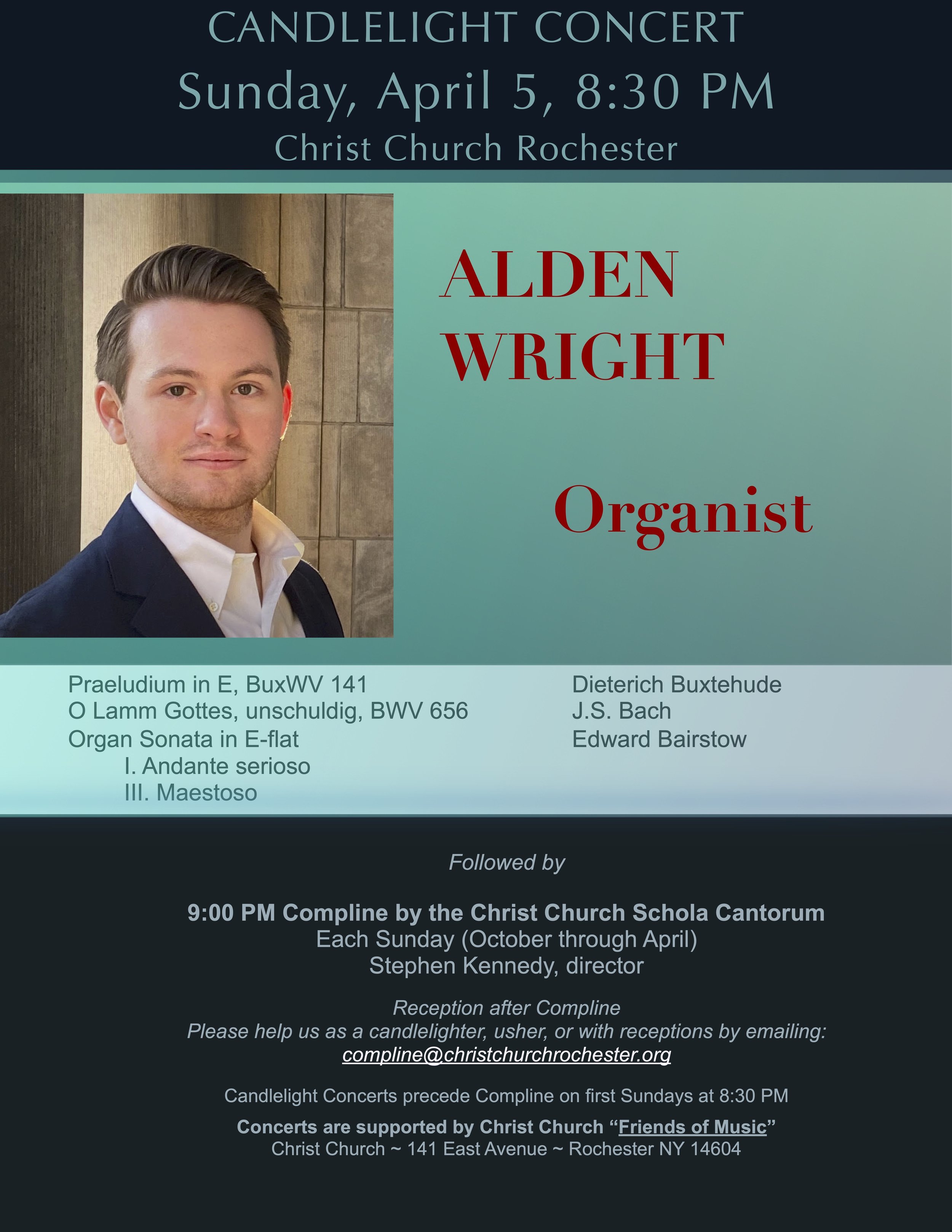 Make this the joyous end to your weekend: Compline, preceded by the first Candlelight Concert. The Candlelight Concert begins at 8:30 p.m.; Compline begins at 9 p.m. Both events take place at Christ Church, 141 East Avenue.