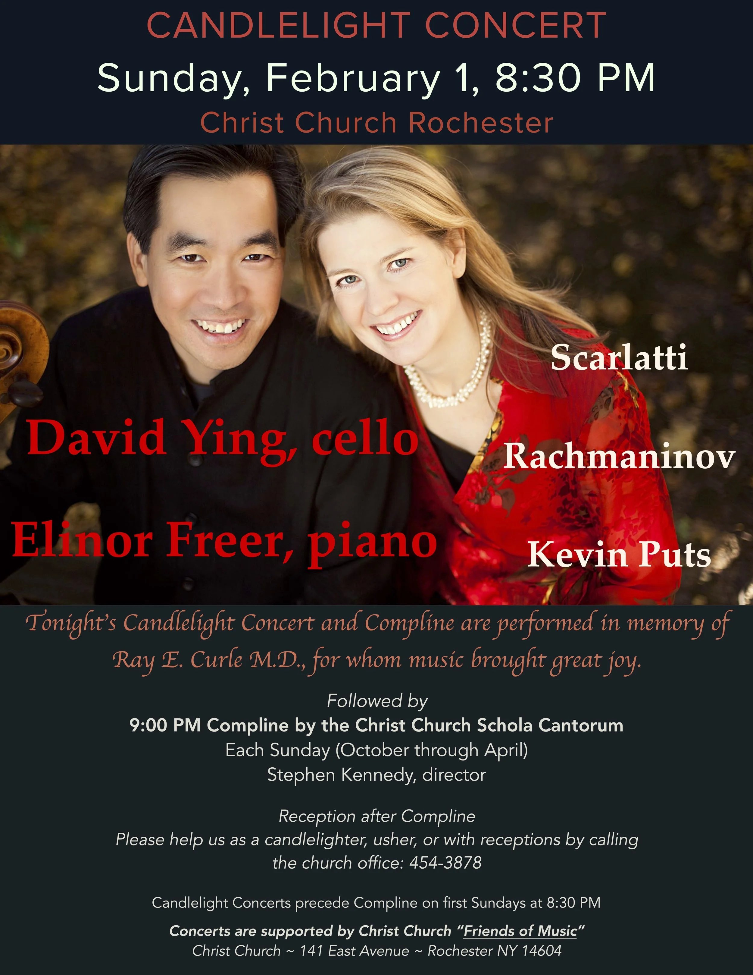 will return on the first Sunday in October and will be preceded by the first Candlelight Concert. Compline is observed every Sunday at 9:00pm (October through April) and Candlelight Concerts are on the first Sunday of each month at 8:30pm. Receptions follow Compline in the Guild Room on First Sundays.